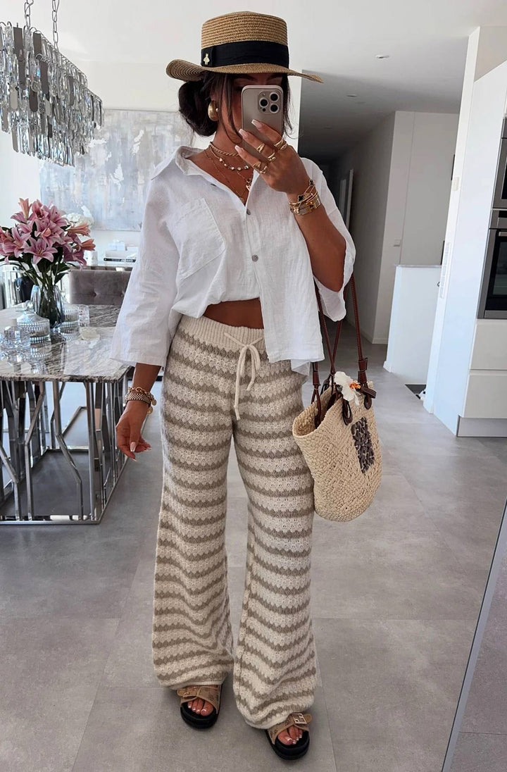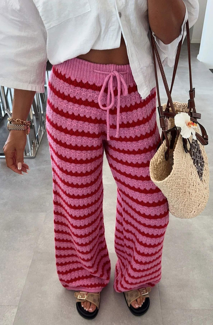 Slip into effortless summer style with our Simone crochet style knitted trousers – where comfort meets cool in every stitch! Whether you’re beach bound or brunching with the girls, these trousers will be your go-to vibe setter. 🌴☕✨Simone Crochet Knitted Striped Wide-Leg Drawstring Trousers 💖