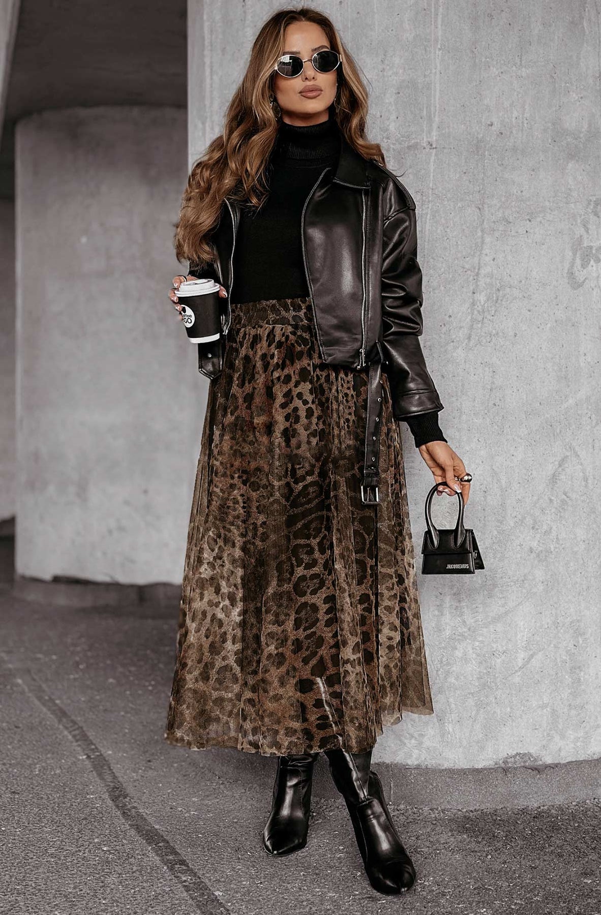 Designed with a soft, layered mesh that moves beautifully, this skirt blends bold animal-inspired design with light, feminine fluidity. Its flattering A-line midaxi shape flows gracefully with every step, adding boutique drama to any outfit.