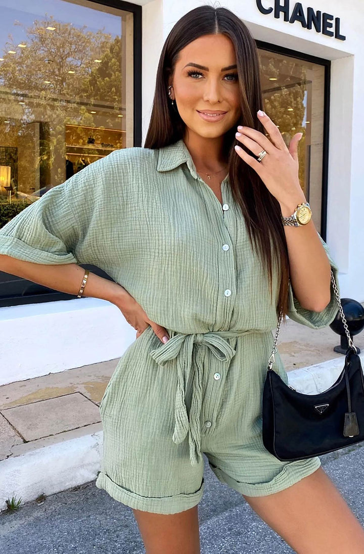 Sallie Belted Cotton Gauze Style Playsuit-Khaki